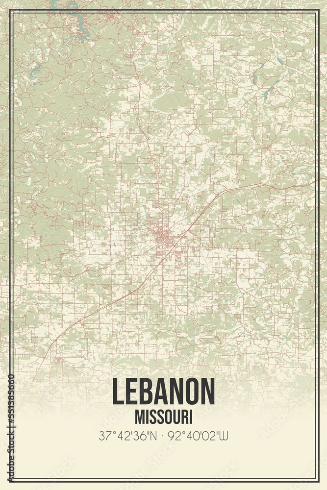 Retro US city map of Lebanon, Missouri. Vintage street map. Stock